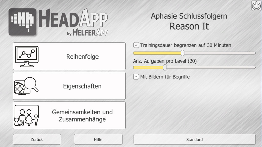 Die Option „Mit Bildern für Begriffe“ kann auch abgeschaltet werden, falls die Hilfestellung über Bilder nicht gewünscht ist oder der Trainierende durch die Bilder zu sehr abgelenkt wird.